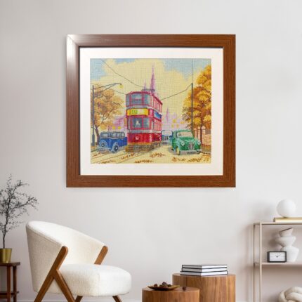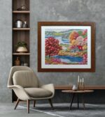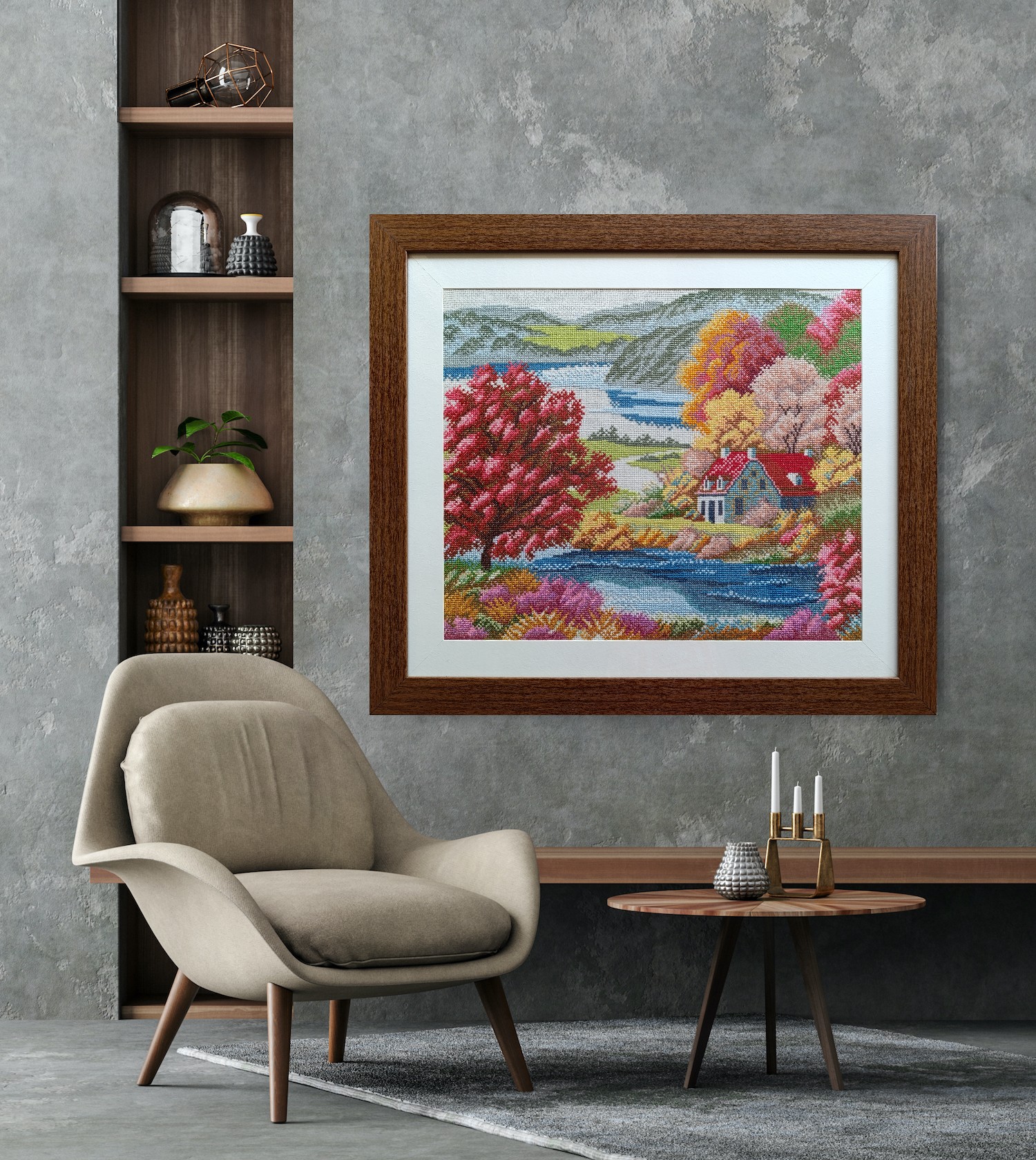 Transport yourself to a peaceful lakeside retreat with this breathtaking cross-stitch. The artwork showcases a cozy cottage nestled amongst a vibrant explosion of autumn colors and a serene river. Handcrafted with meticulous detail, this piece captures the rich hues and tranquility of nature. The rustic wood frame highlights the detailed stitching, making it a perfect gift for nature enthusiasts and those who appreciate peaceful, scenic art.