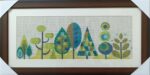 This framed, rectangular cross-stitch wall hanging features a highly stylized and abstract forest landscape. The piece is dominated by a cool, clean color palette of greens and blues with touches of yellow, depicting various trees and foliage shapes. The geometric patterns within the trees—including spheres, triangles, and abstract shapes—give the artwork a strong Mid-Century Modern or Scandi-inspired aesthetic.