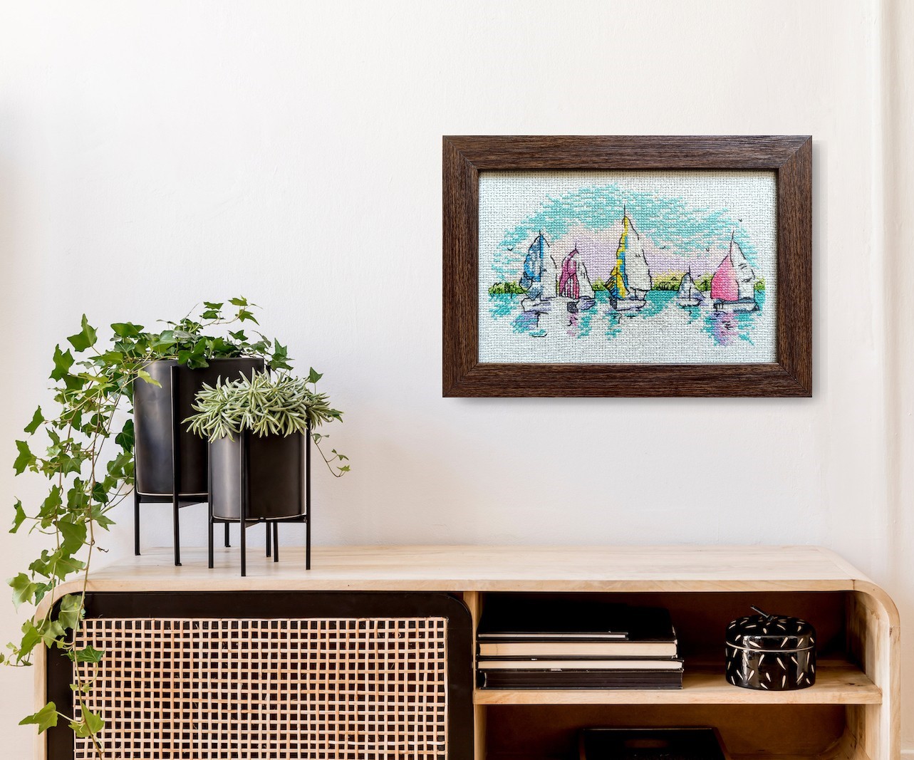 Experience the calm beauty of a serene harbor with this exquisite cross-stitch piece, featuring colorful sailboats drifting over shimmering waters under a pastel sky. Framed in a rich wooden border, this handmade artwork brings a touch of seaside tranquility and artisanal charm to any home décor.