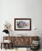 Escape to the countryside with this charming cross-stitch artwork. The piece features a quaint cottage with a purple roof, surrounded by lush lavender bushes and peaceful trees. Handcrafted with intricate detail, this artwork evokes a sense of calm and rustic beauty. The rich, dark wood frame perfectly complements the delicate stitching, making it a wonderful addition to any home and an ideal gift for nature lovers.