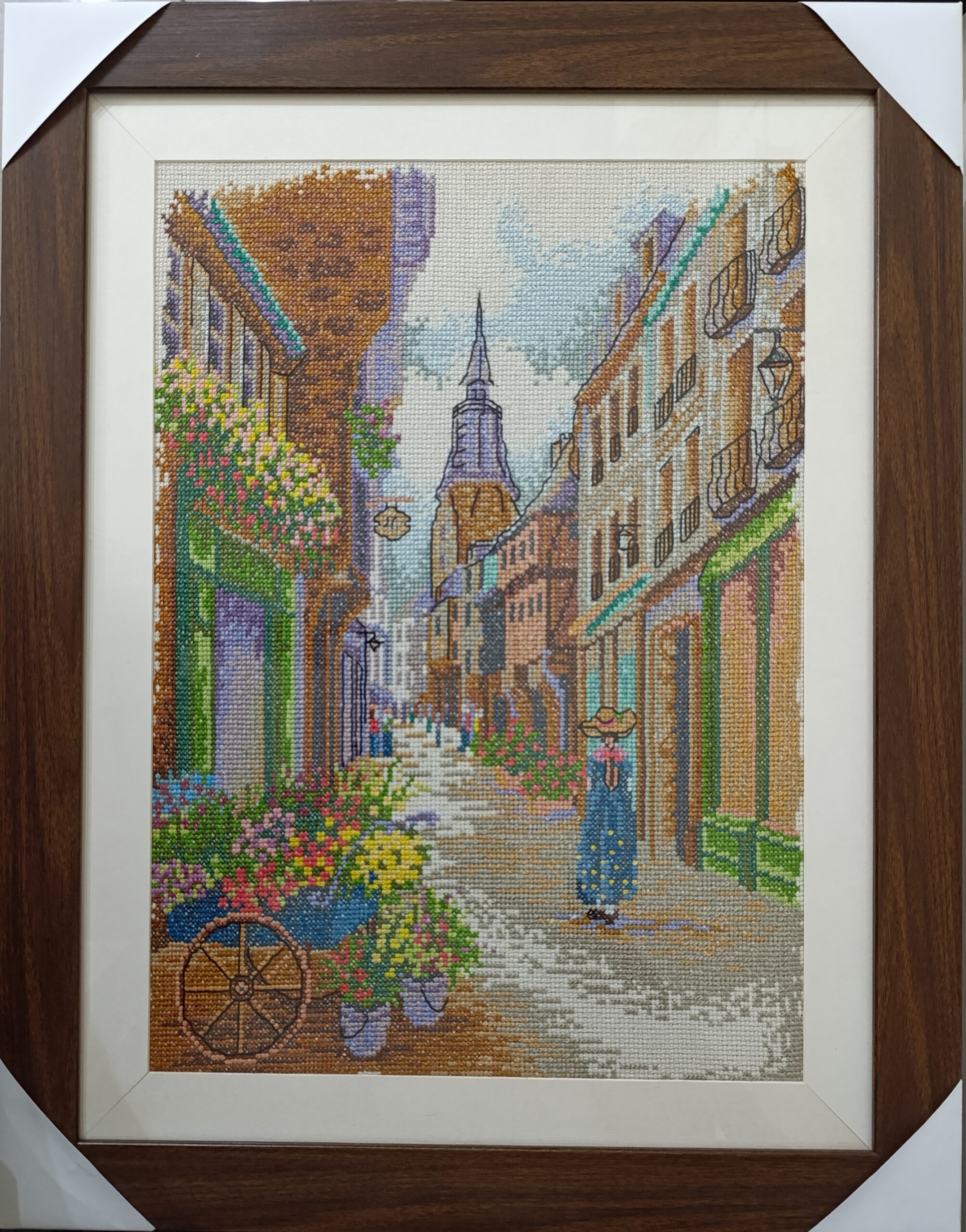 A brilliant burst of color from a rustic flower vendor’s cart brings the warmth and romance of a bustling market day into your home. A lone figure in a wide-brimmed hat strolls through the sun-dappled lane, adding timeless serenity. Hand-stitched with delicate texture and rich color, this cross-stitch piece is a one-of-a-kind treasure—framed and ready to add vintage charm and artisan quality to any room.