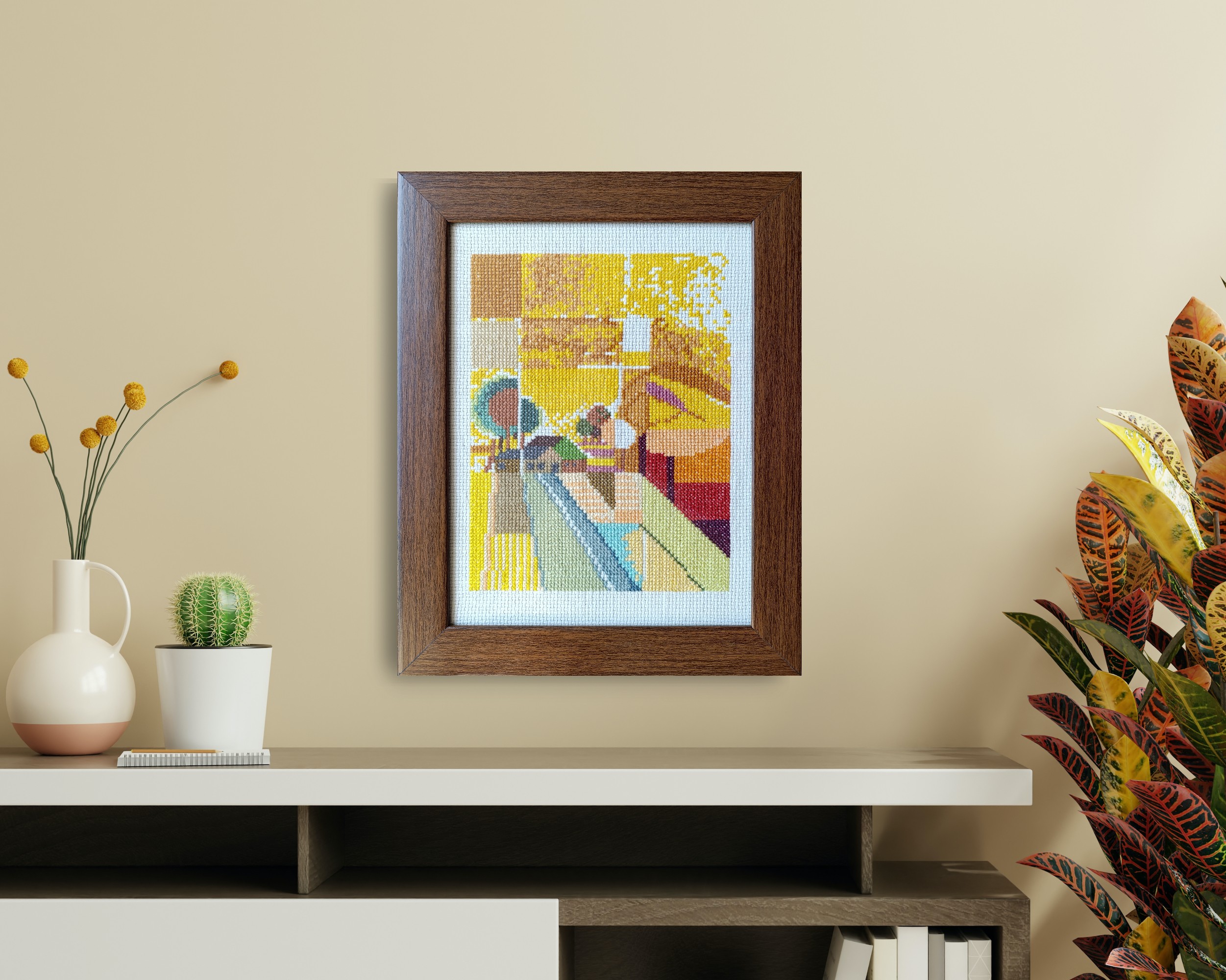 A warm celebration of rural charm, this cross-stitch artwork captures golden fields, winding paths, and rustic scenery in a vibrant patchwork of color. Framed in rich wood, this handmade piece brings the glow of countryside beauty and artisanal texture into any home.