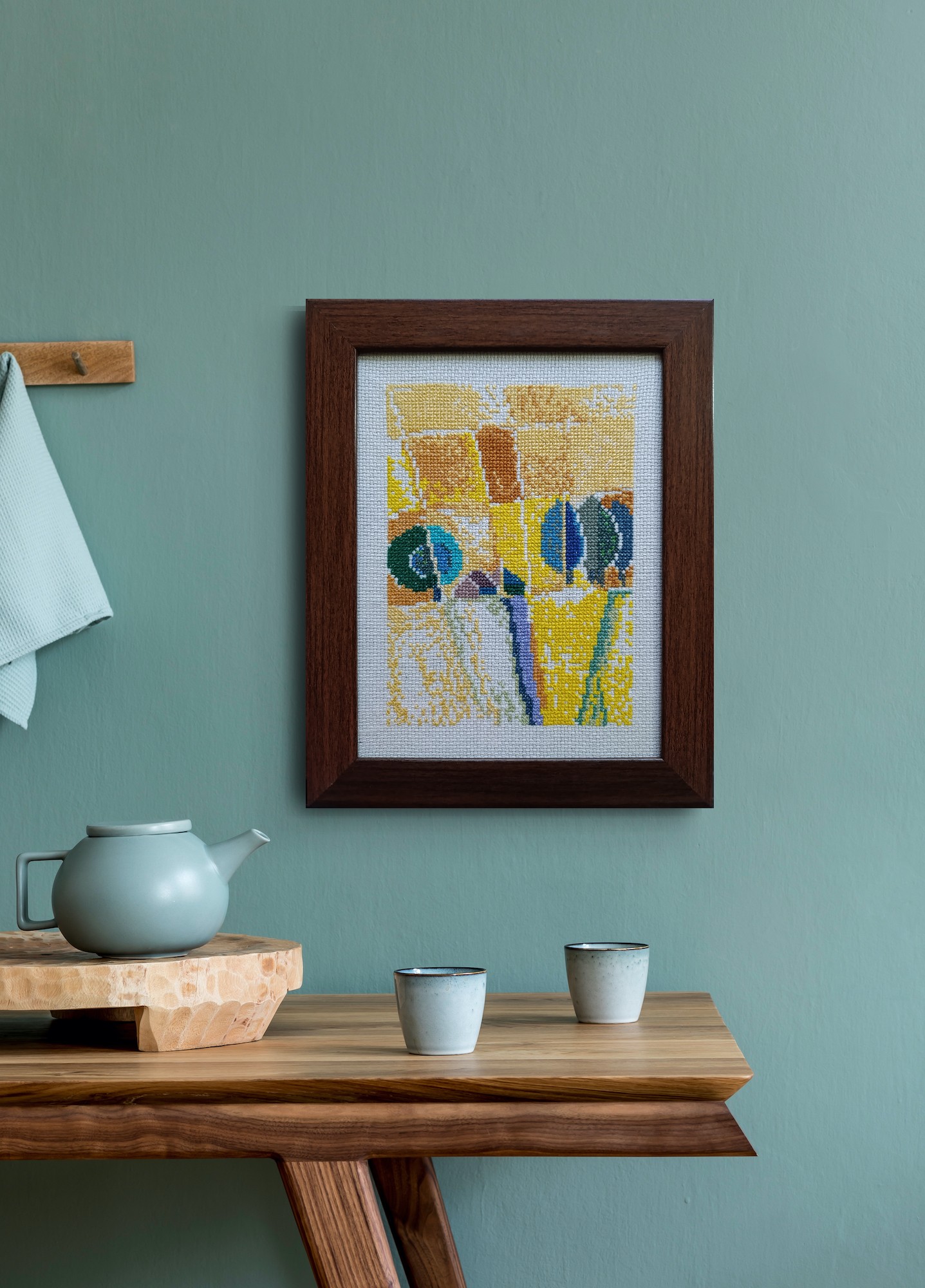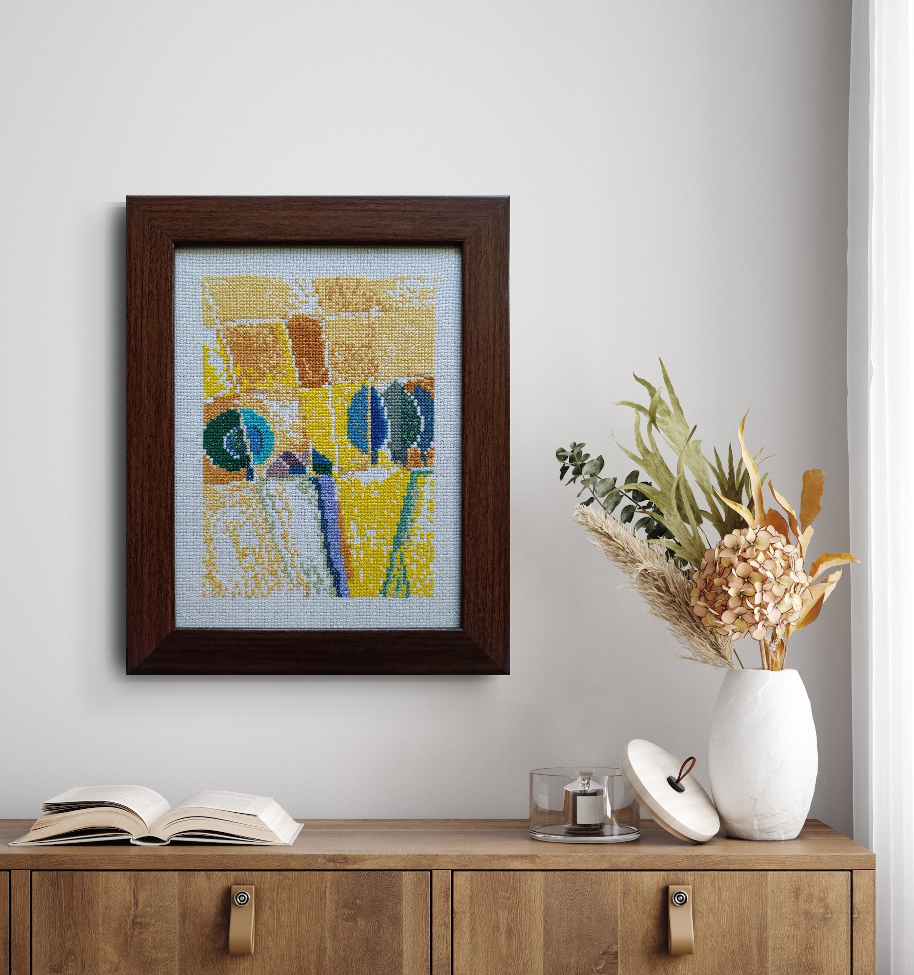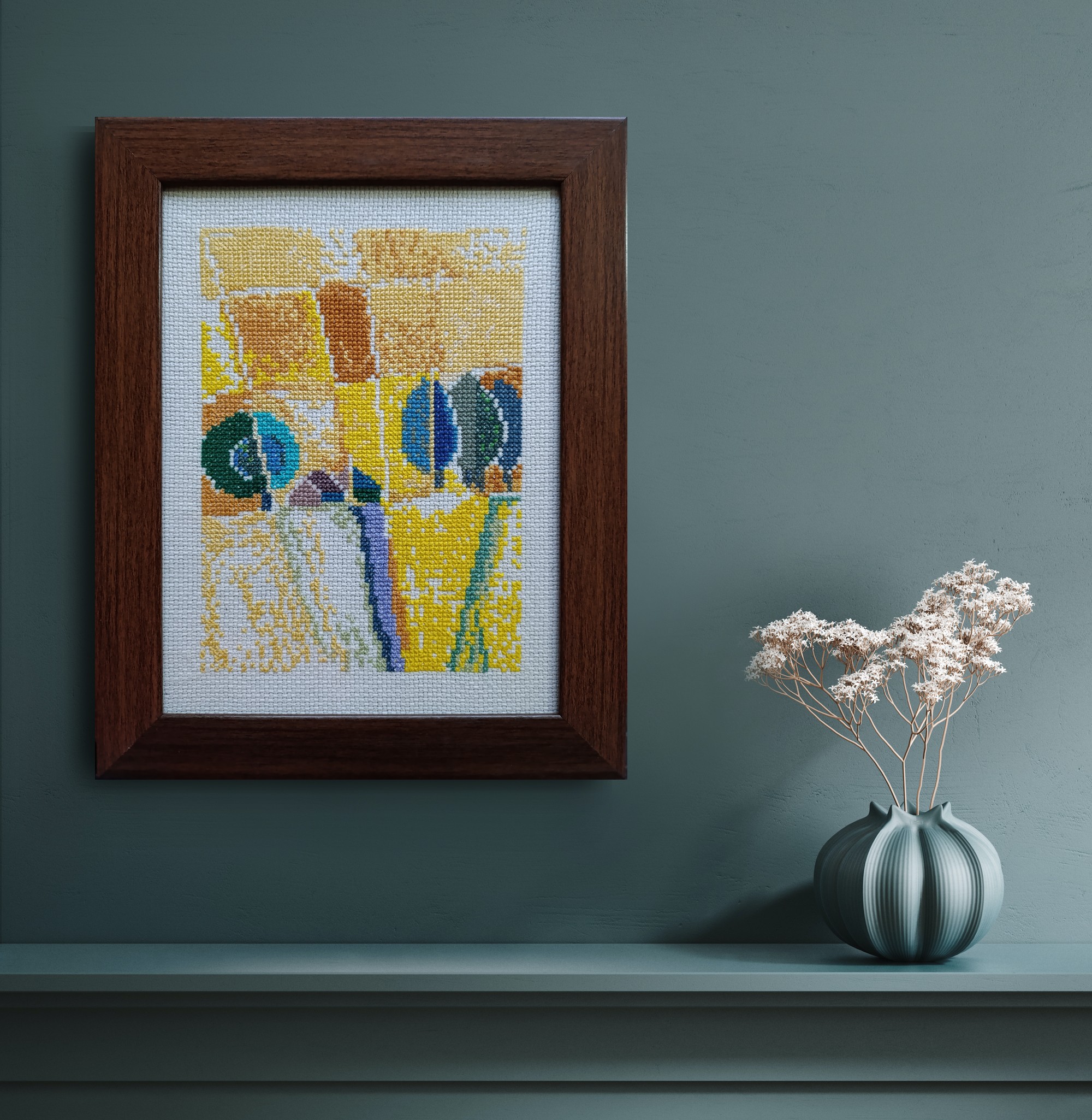 Introduce a touch of modern art to your space with this abstract cross-stitch. Featuring a dynamic mix of yellow, brown, and blue tones, this piece creates a captivating visual texture. Each stitch contributes to a rich, contemporary design that adds a unique flair to any room. Framed in rich wood, it’s a perfect gift for art enthusiasts or anyone seeking a bold, handcrafted statement piece.